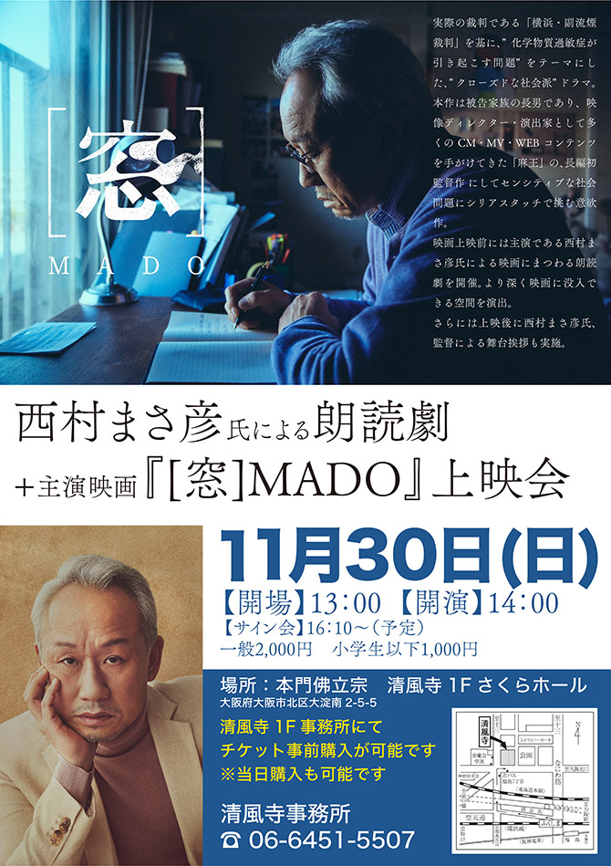 映画『[窓] MADO』は、実際の裁判である「横浜・副流煙裁判」を基に、”化学物質過敏症が引き起こす問題”をテーマにした、”クローズドな社会派”ドラマです。本作は被告家族の⻑男であり、映像ディレクター・演出家として多くのCM・MV・WEBコンテンツを手がけてきた「麻王」の、長編初監督作 にしてセンシティブな社会問題にシリアスタッチで挑む意欲作。劇伴音楽は板倉文。主題歌は小川美潮の「窓」。また映画上映前には主演である西村まさ彦氏による映画にまつわる朗読劇を開催。より深く映画に没入できる空間を演出されます。さらには上映後に西村まさ彦氏、監督による舞台挨拶にて、映画制作の舞台裏のお話を聞くことができます。