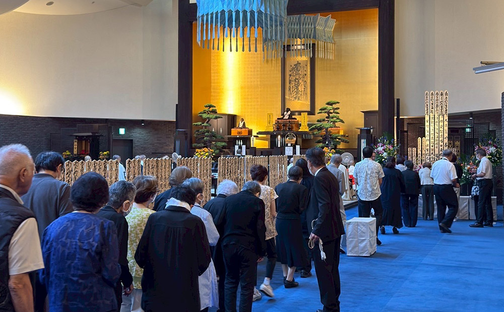100基を超える特別白大塔婆・白大塔婆・白塔婆を本堂右側祭壇に建立して荘厳し、参詣者全員にお焼香いただきました。また納骨室にも焼香台を設置し、本堂での法要終了後に参詣者の多くが納骨室に移動し焼香をしました。