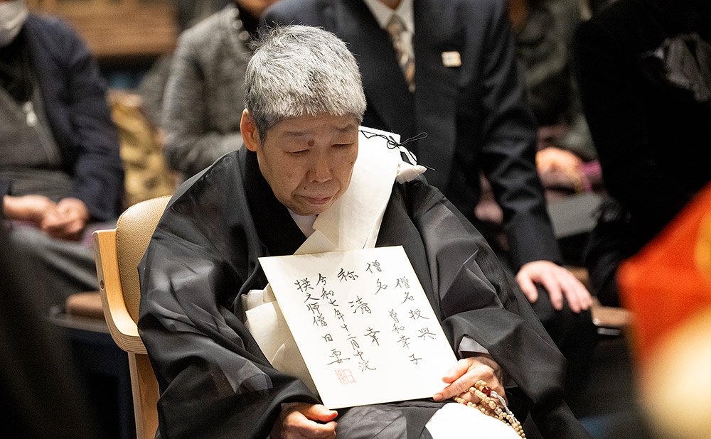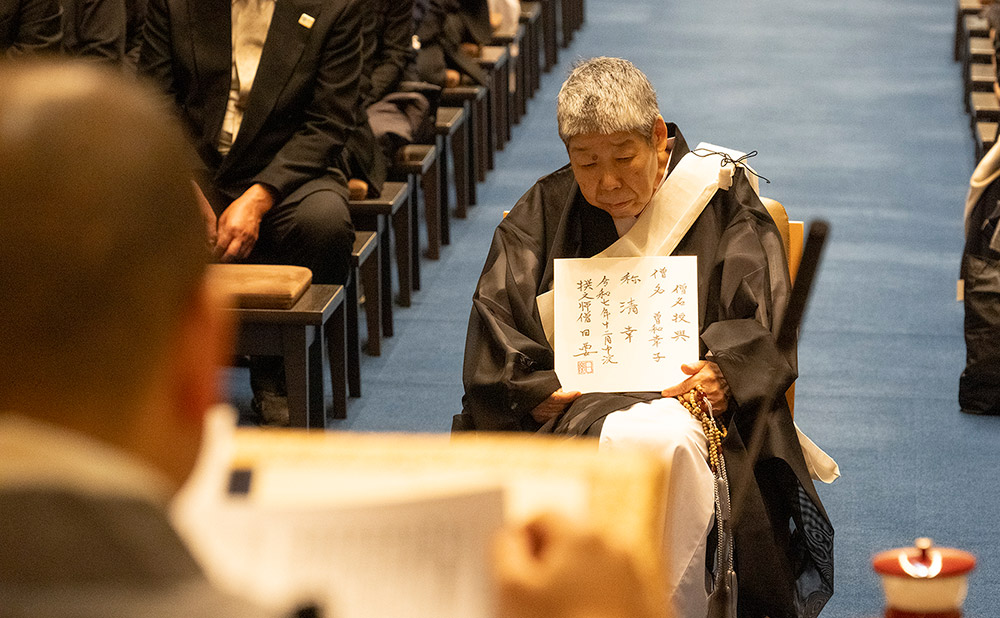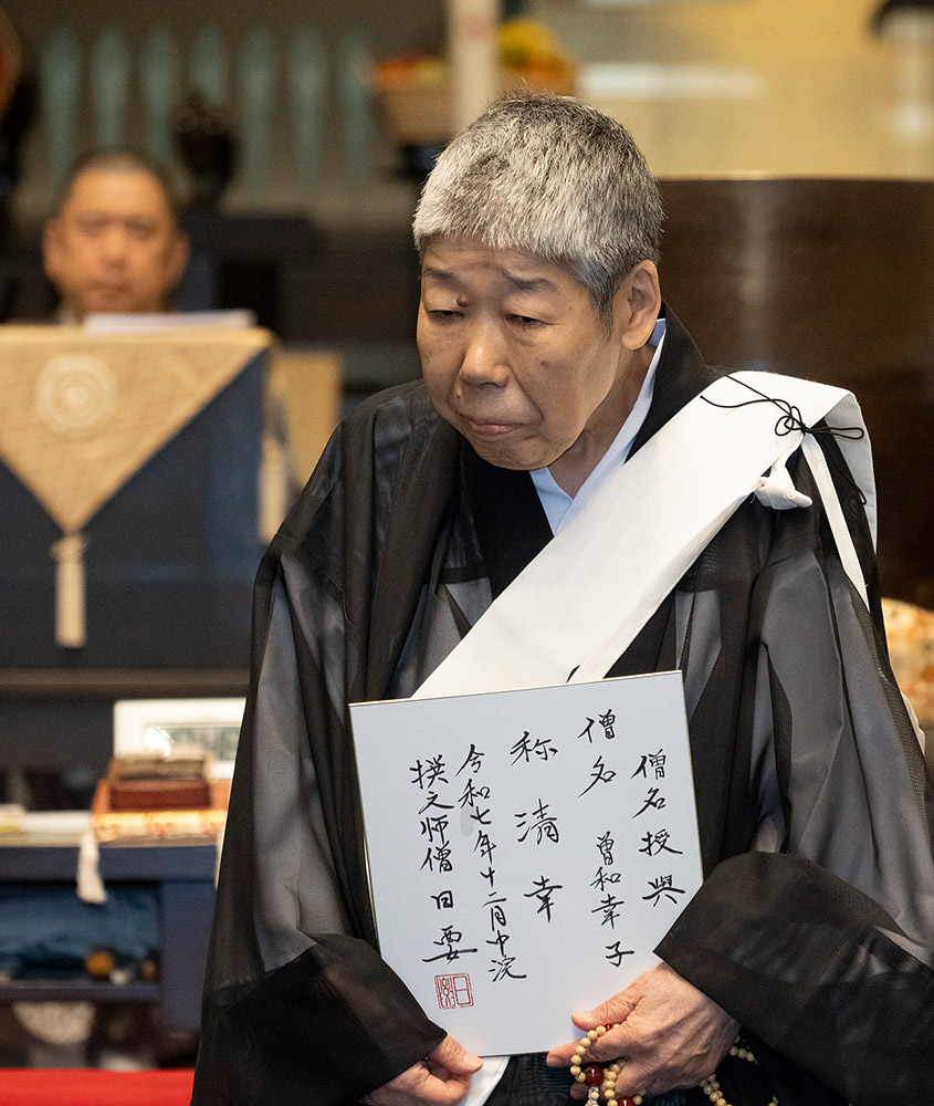 得度式では、無始已来の後、剃髪の儀が執り行われ、日要御導師より僧名「清幸〔せいこう〕」を拝受されました。